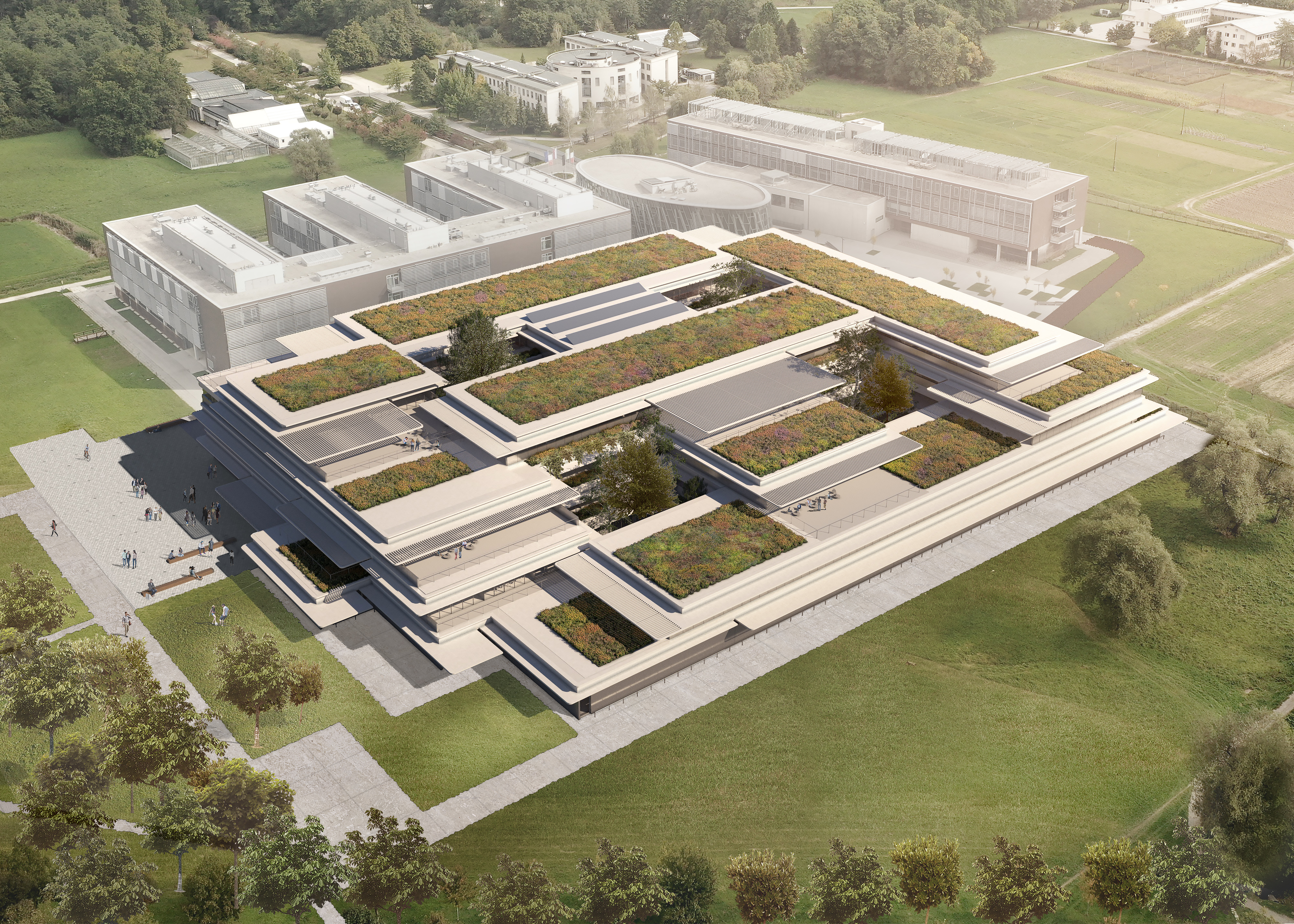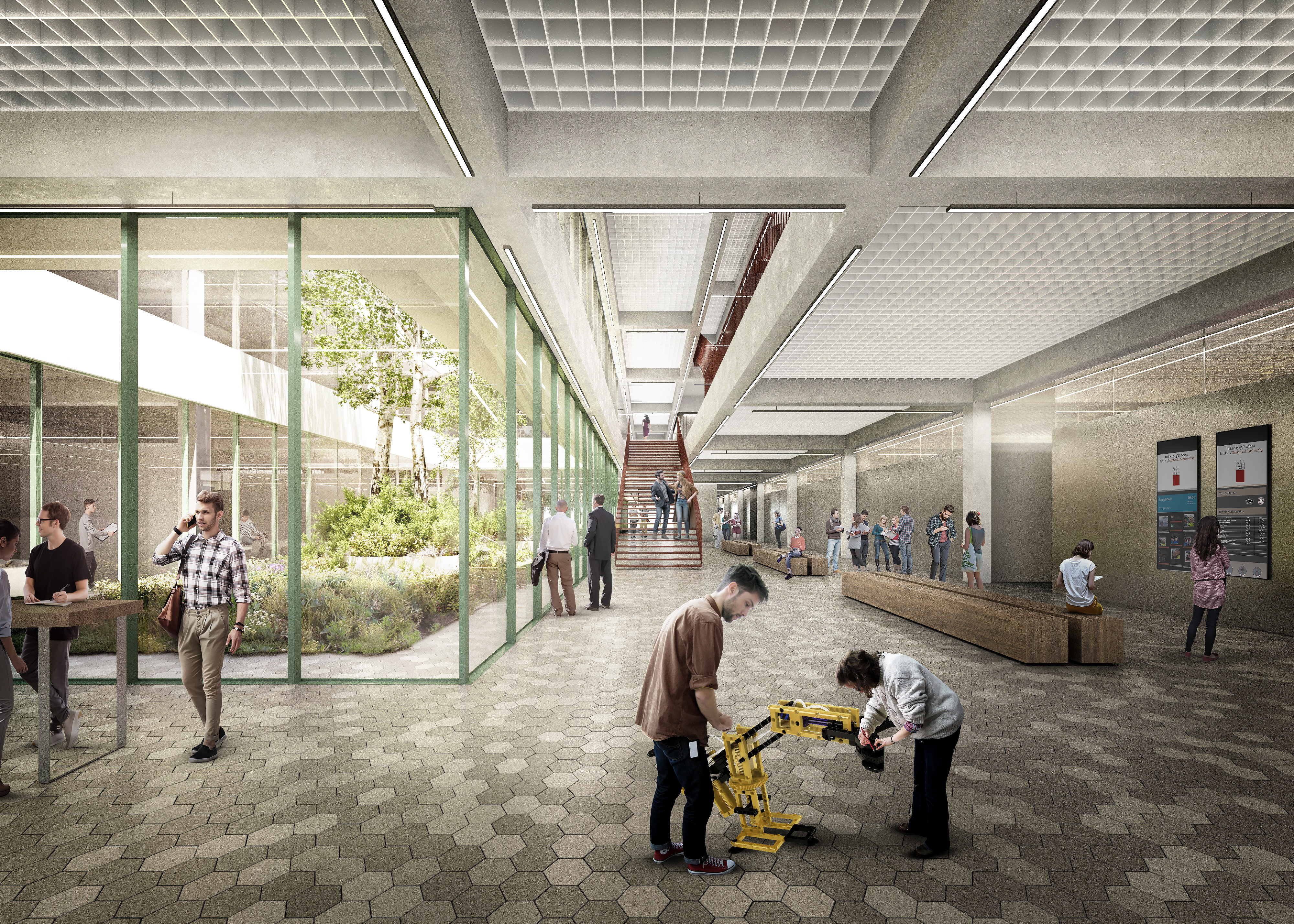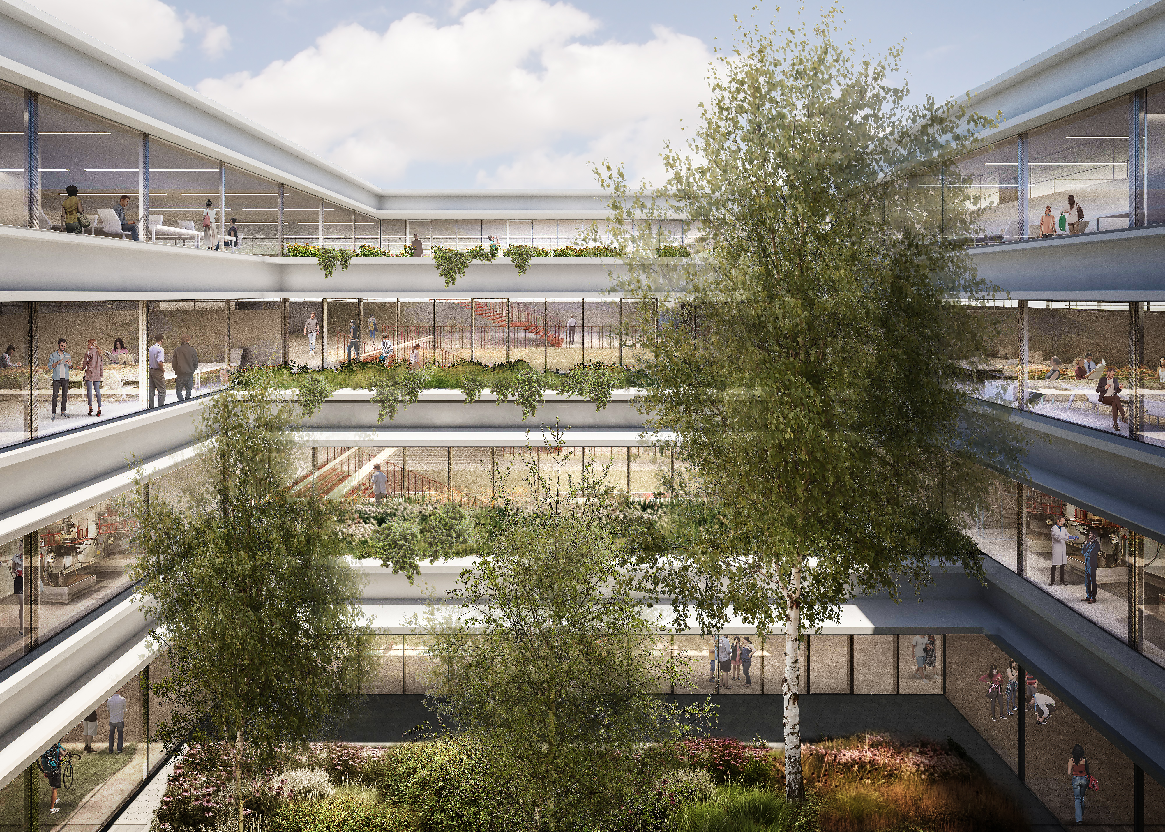 Stavba ima štiri velike ozelenjene atrije. Atriji zagotavljajo naravno osvetlitev komunikacijskih prostorov in laboratorijev.